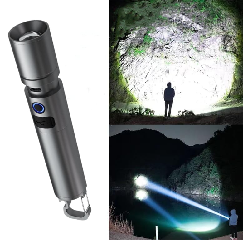 Zoomable & 3 Ligth Modes: This flashlight led rechargeable torch has 3 lighting modes: High-Low-Strobe. According to our needs, we can stretch the head of the handheld flashlights to adjust the focus, freely choose long-distance observation and wide-range lighting. It is very suitable for camping, hiking,fishing or any outdoor activities.